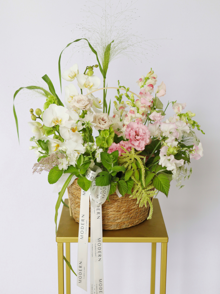 Нежная корзина с орхидеями и летними цветами