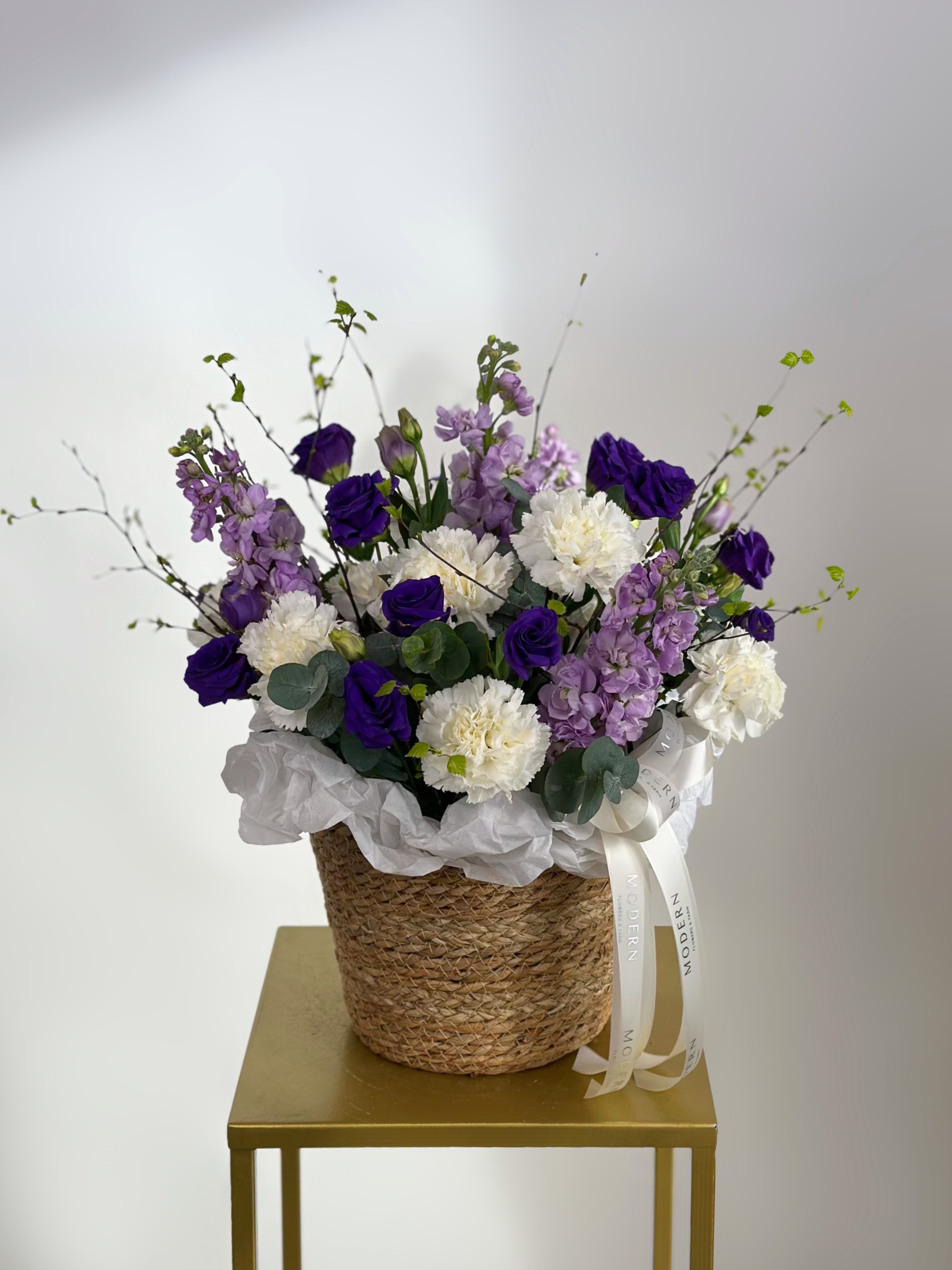—АРОМАТНАЯ МАТТИОЛА, ЭУСТОМА, ВЕСЕННИЕ ВЕТОЧКИ В ПЛЕТЕНОЙ КОРЗИНЕ