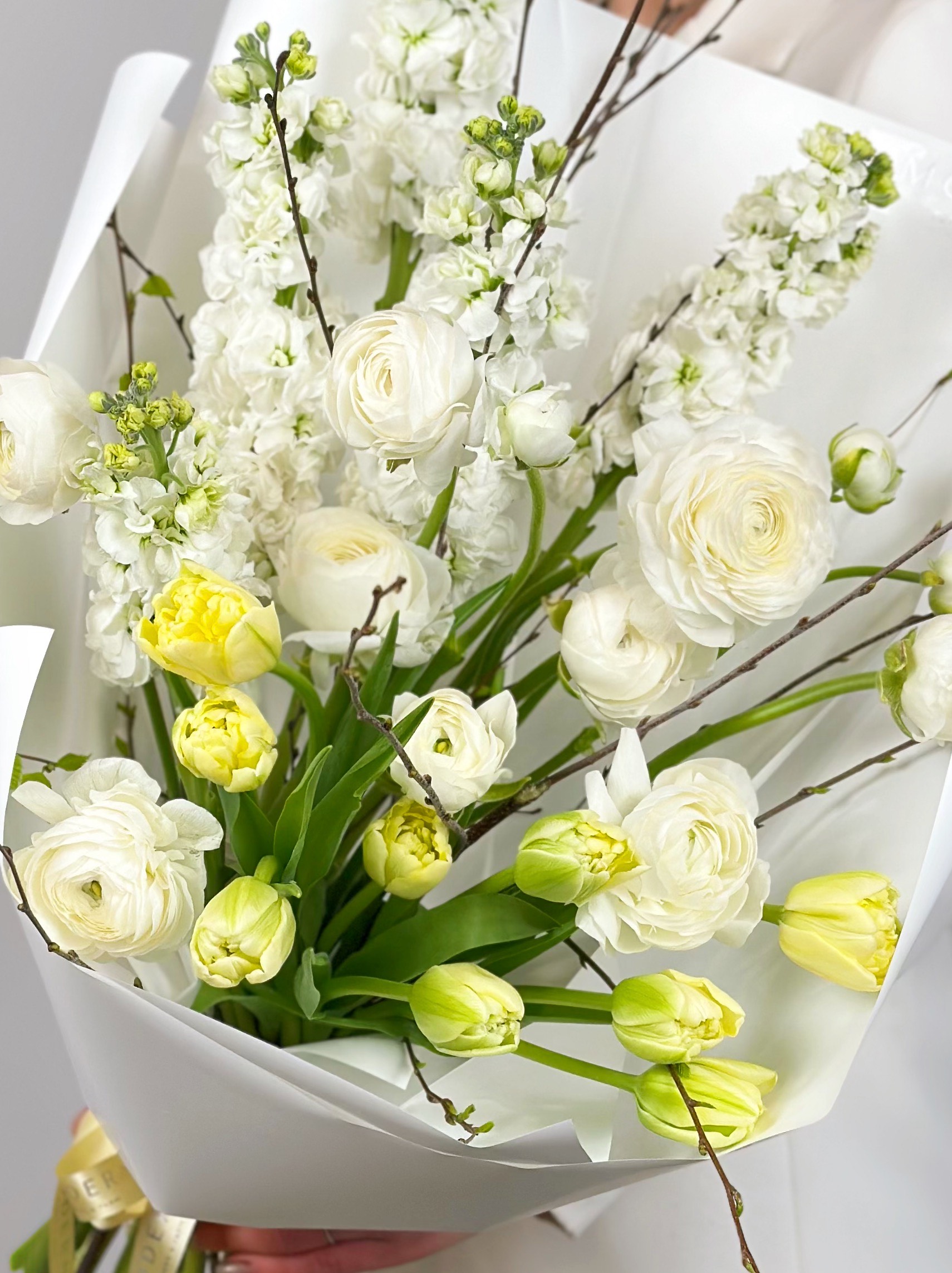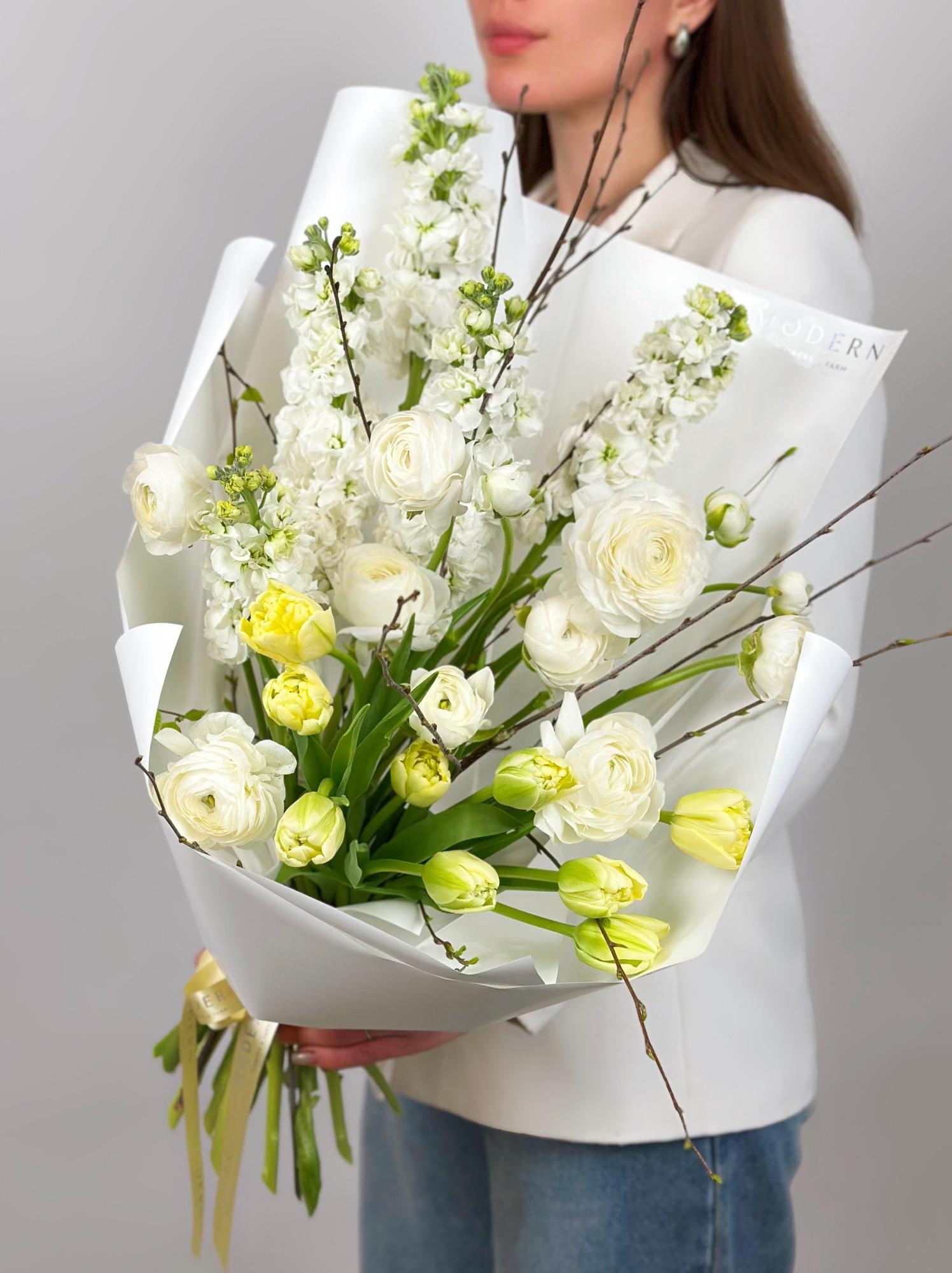 АРОМАТНЫЙ БУКЕТ С МАТТИОЛОЙ, РАНУНКУЛЮСАМИ И ТЮЛЬПАНАМИ