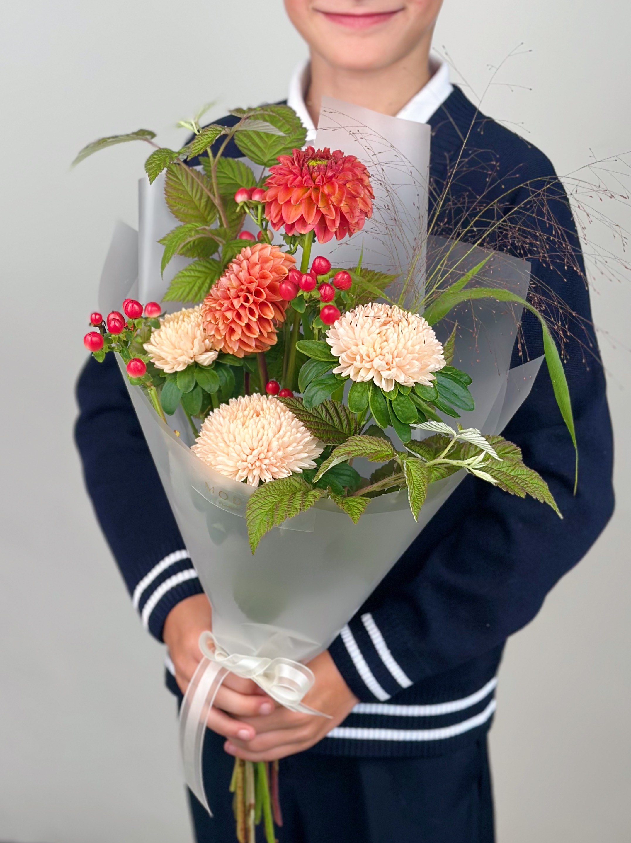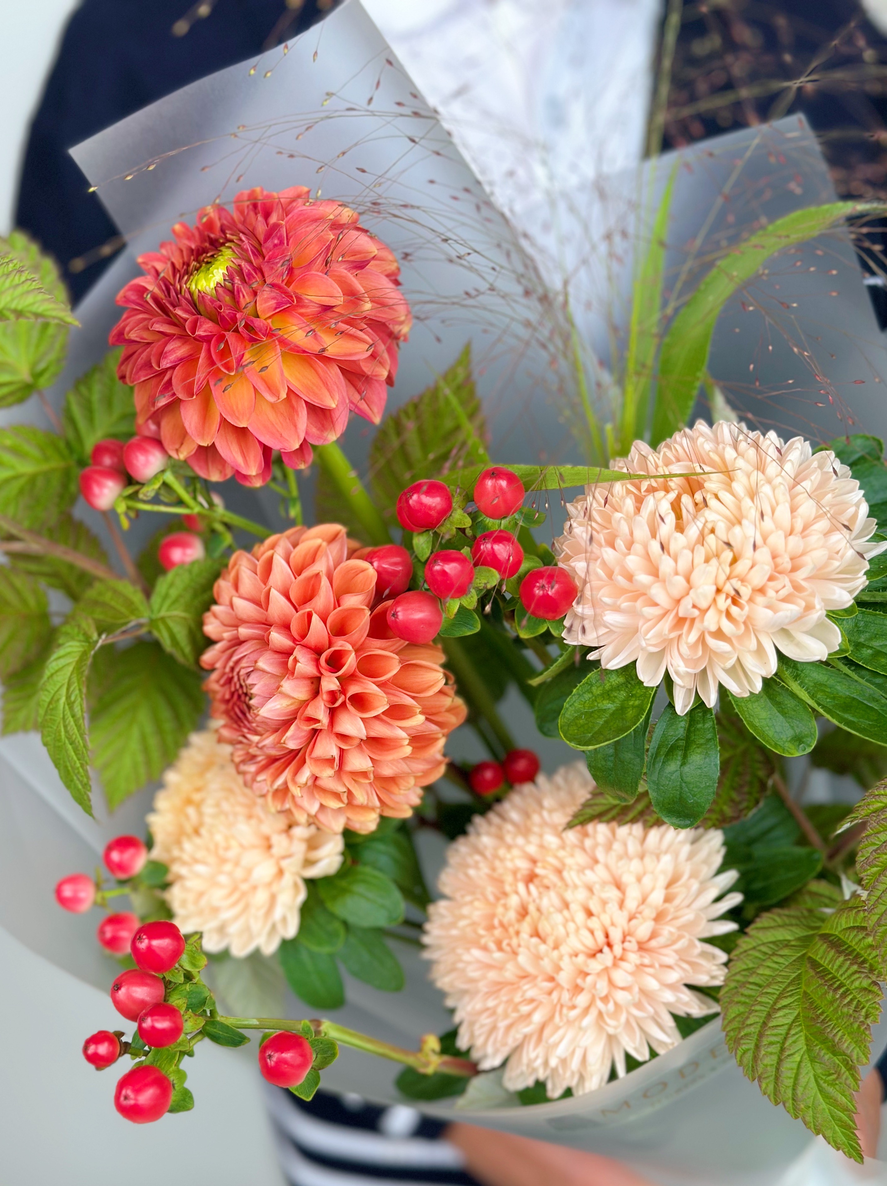 БУКЕТ С ГЕОРГИНАМИ И АСТРОЙ