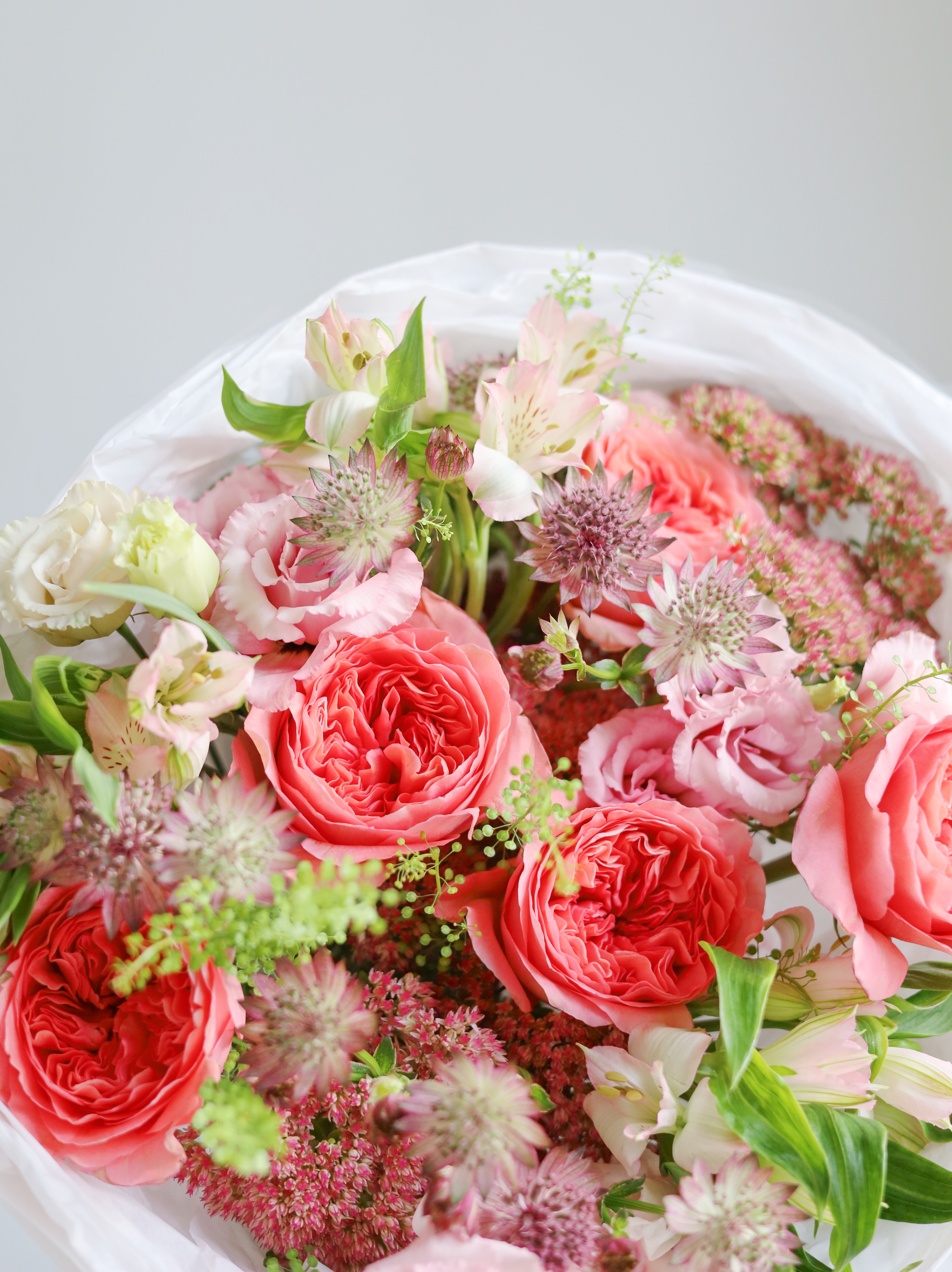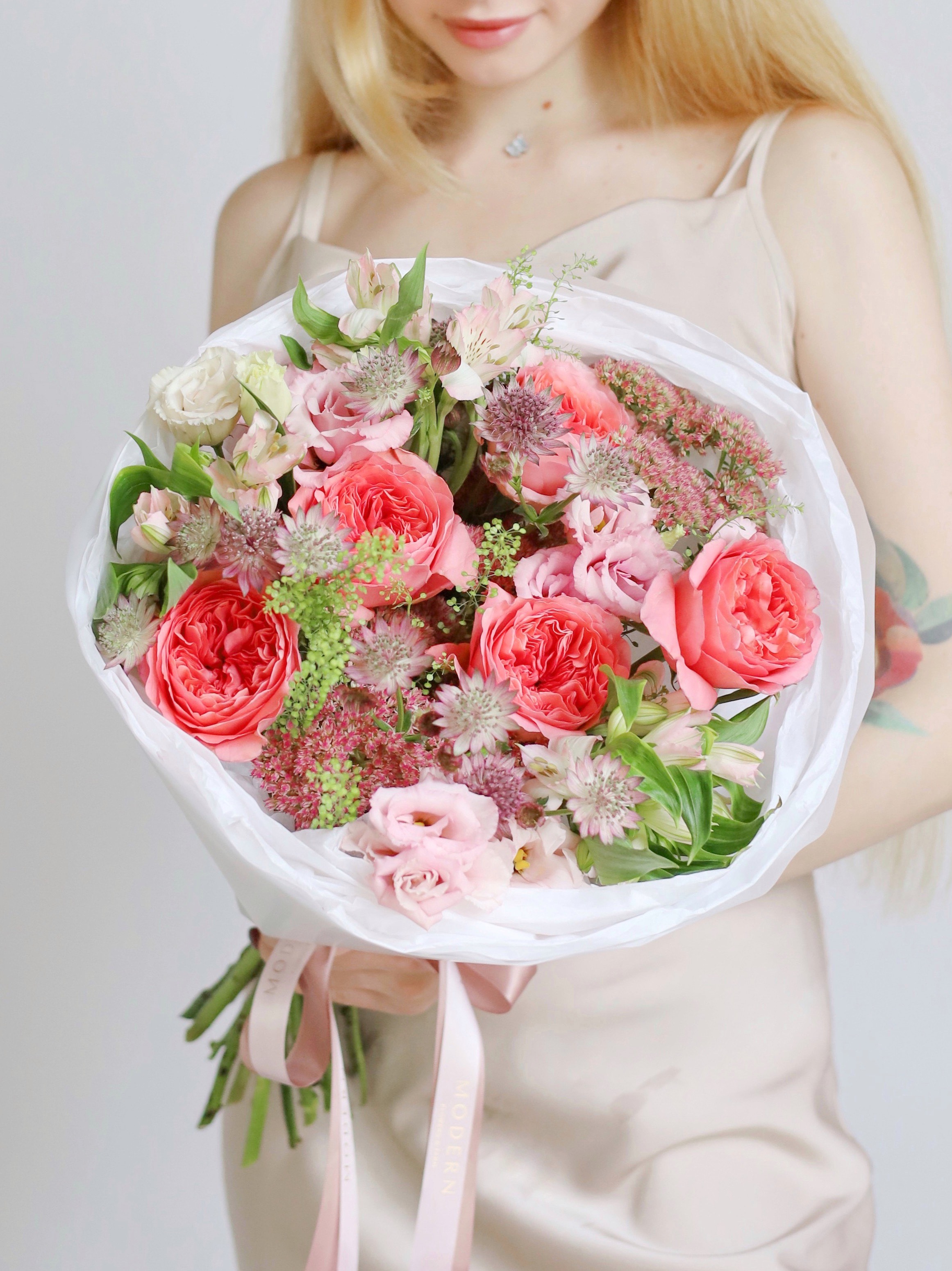 —БУКЕТ С АСТРАНЦИЕЙ, ПИОНОВИДНОЙ РОЗОЙ И АЛЬСТРОМЕРИЕЙ