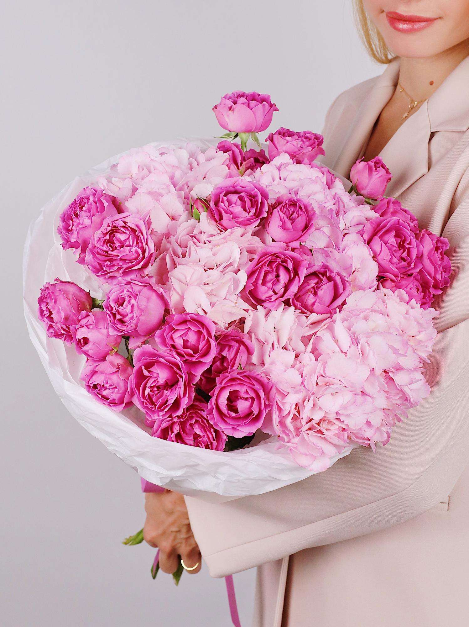 БУКЕТ С ГОРТЕНЗИЕЙ И ПИОНОВИДНОЙ КУСТОВОЙ РОЗОЙ