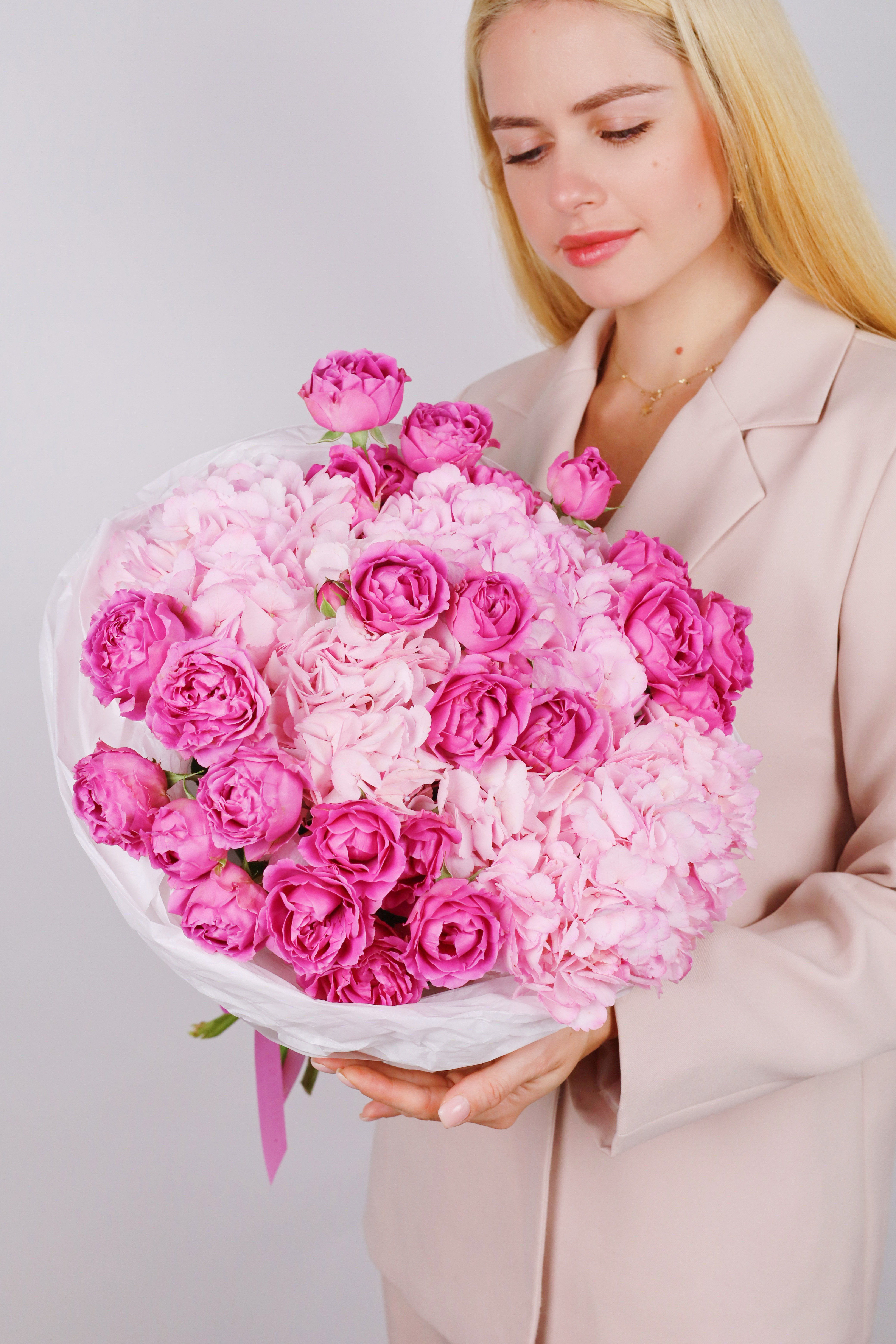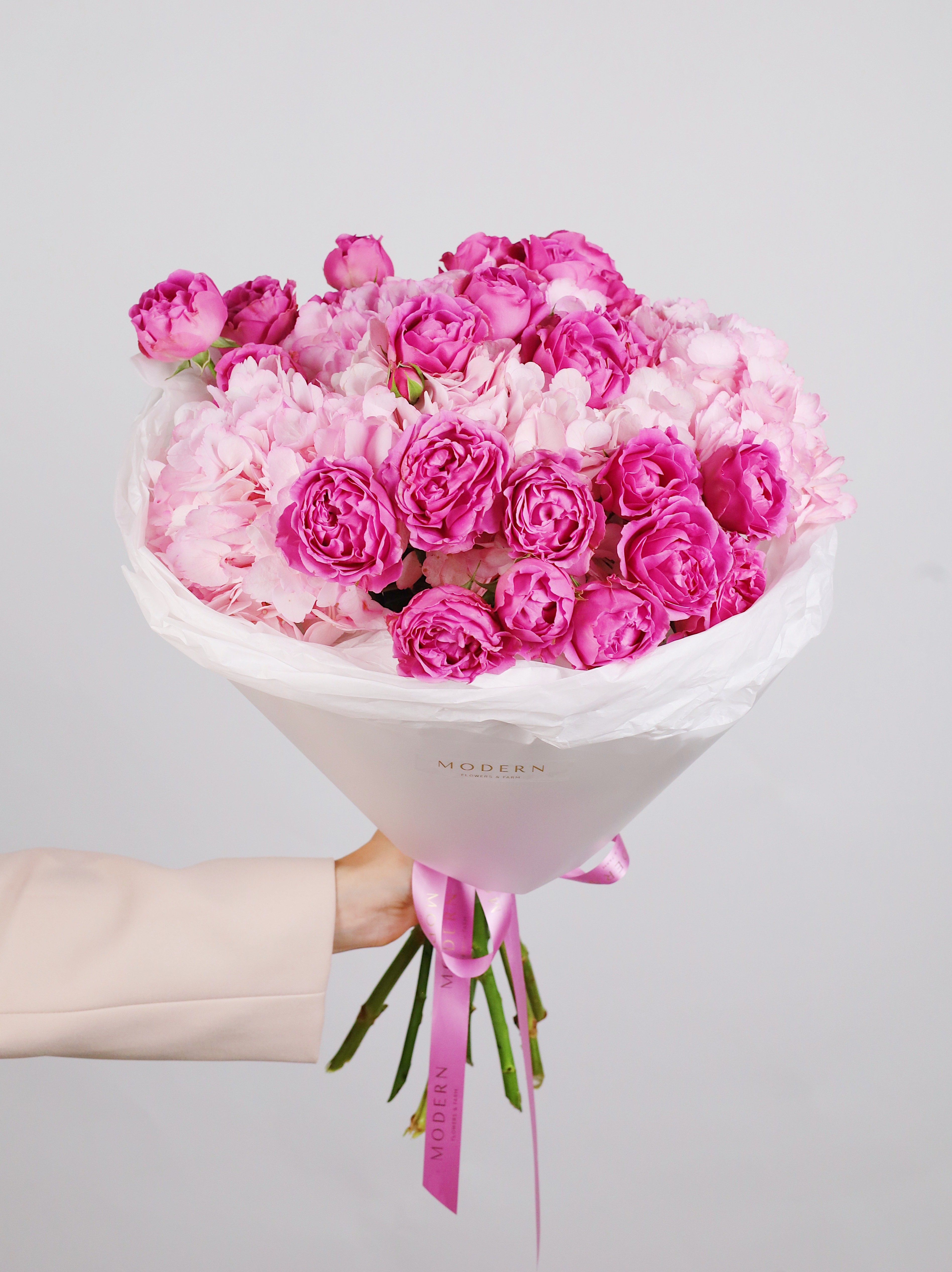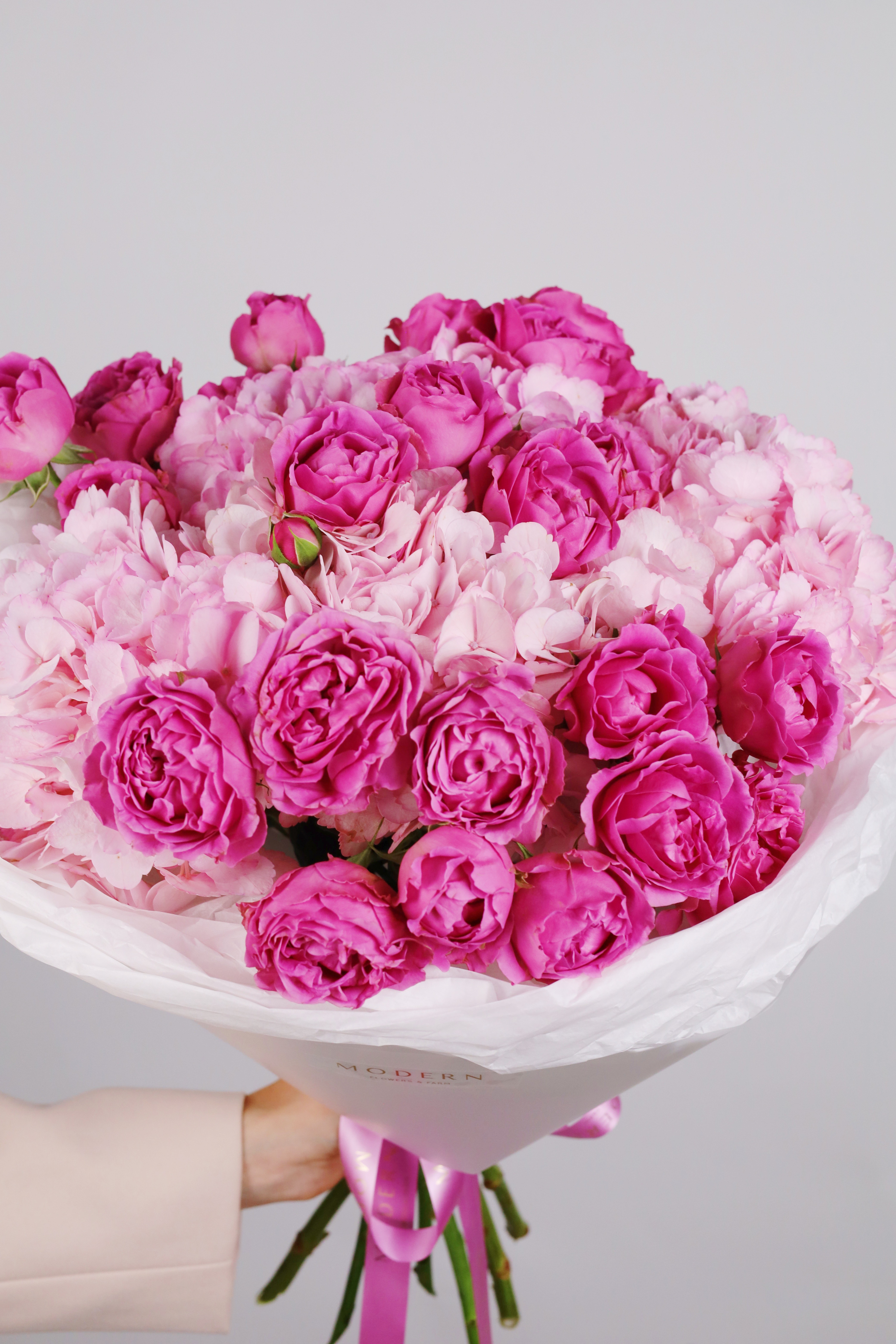 —БУКЕТ С ГОРТЕНЗИЕЙ И ПИОНОВИДНОЙ КУСТОВОЙ РОЗОЙ