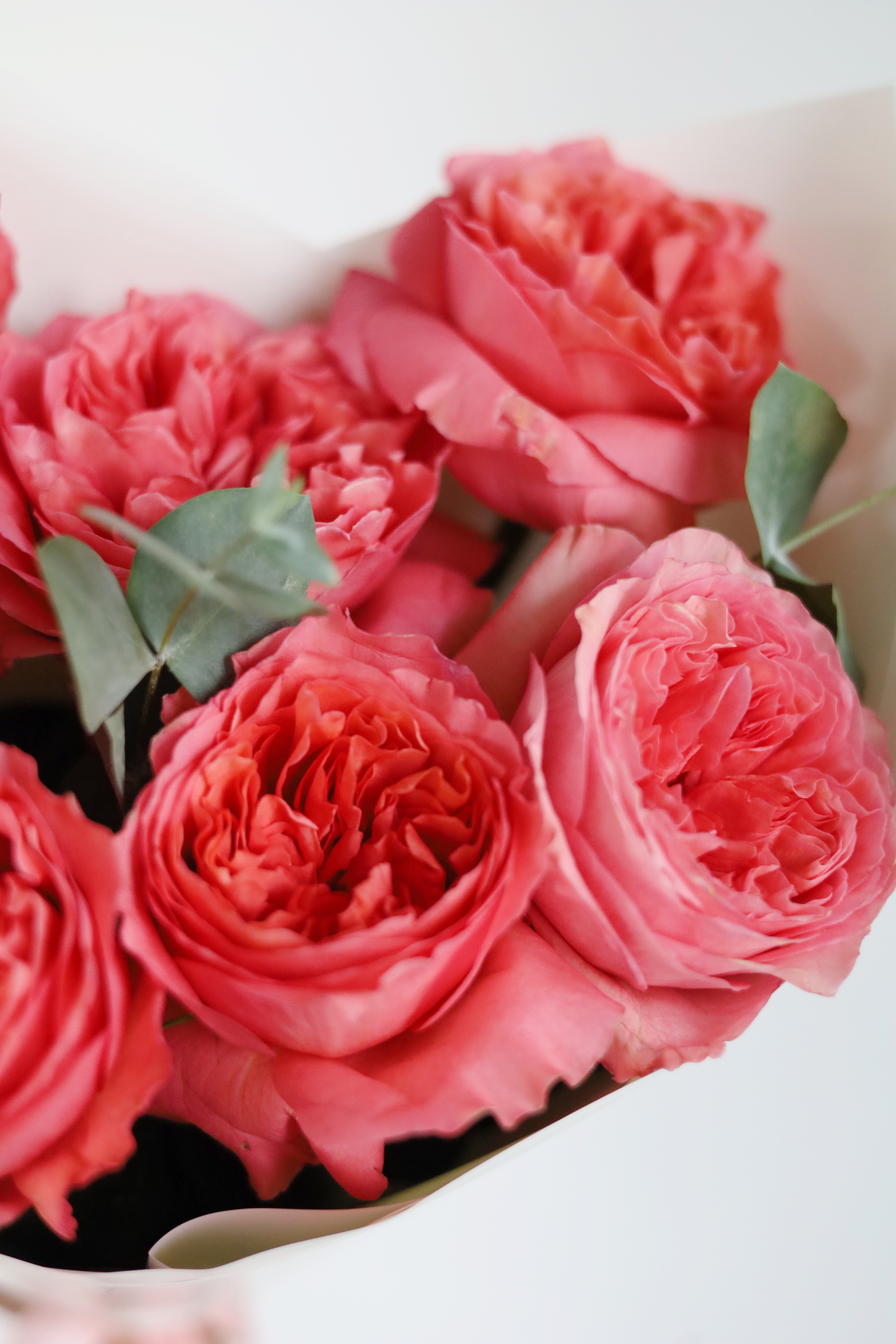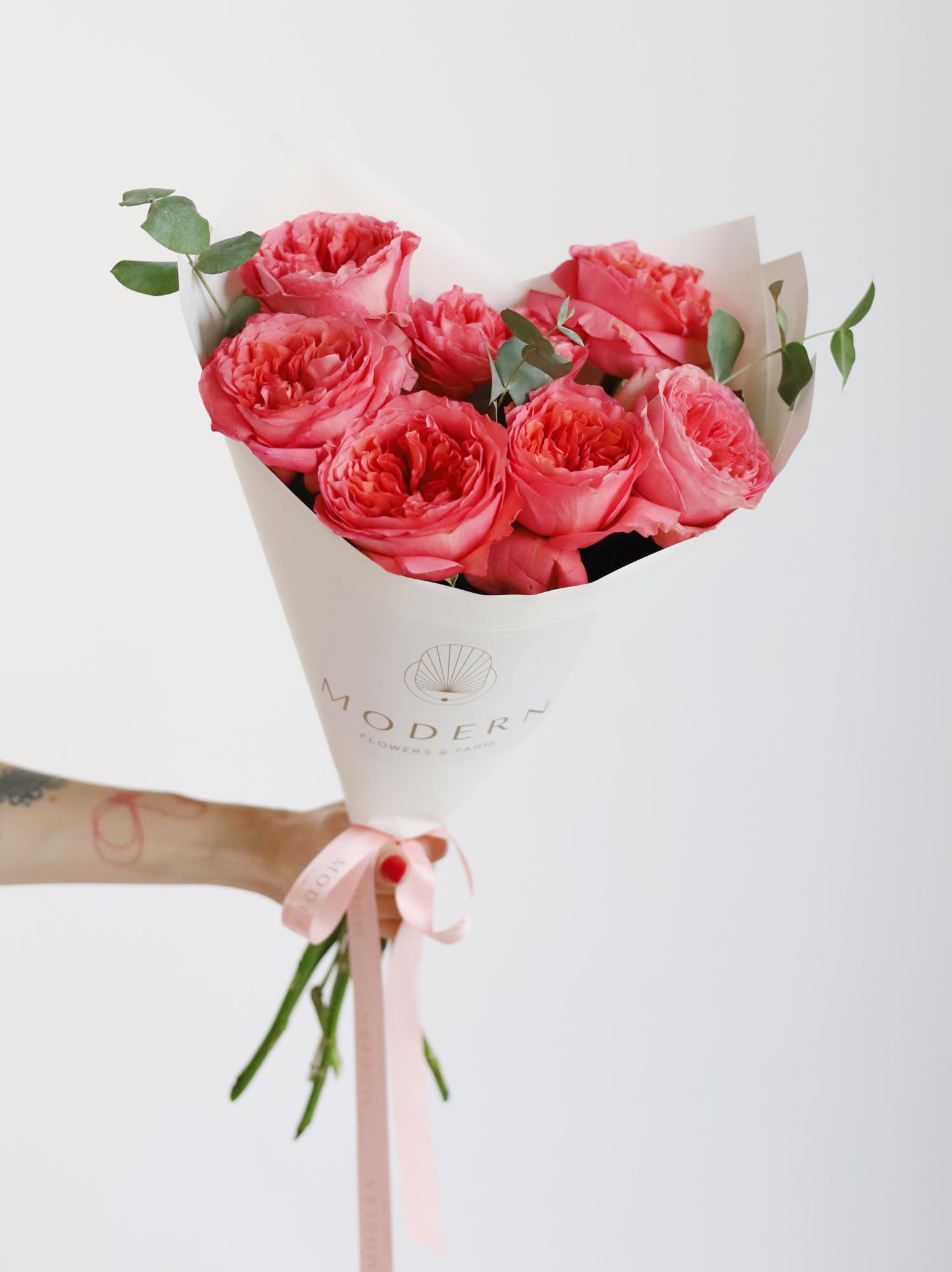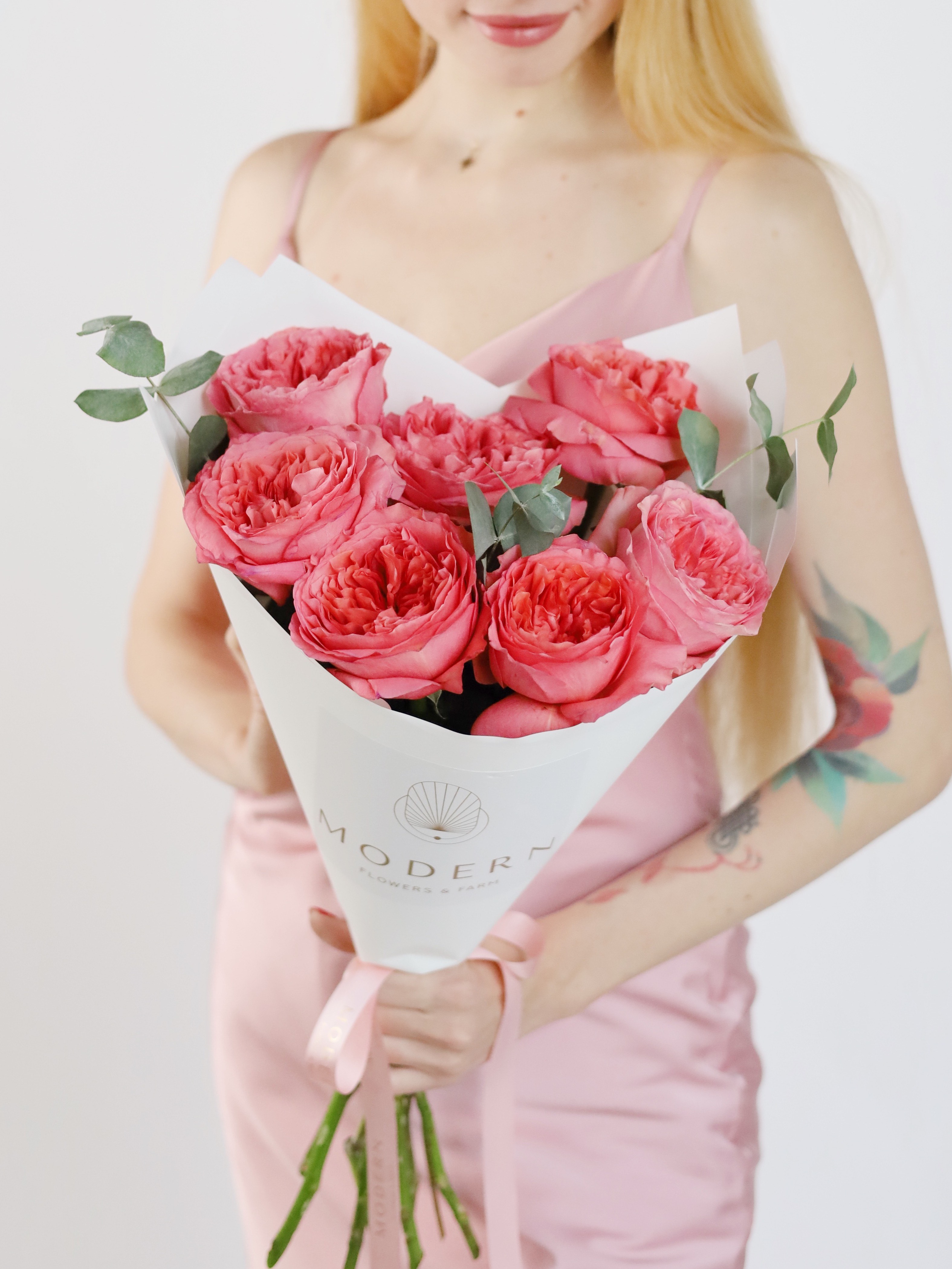 БУКЕТ С РОЗОВОЙ ПИОНОВИДНОЙ РОЗОЙ И ЭВКАЛИПТОМ