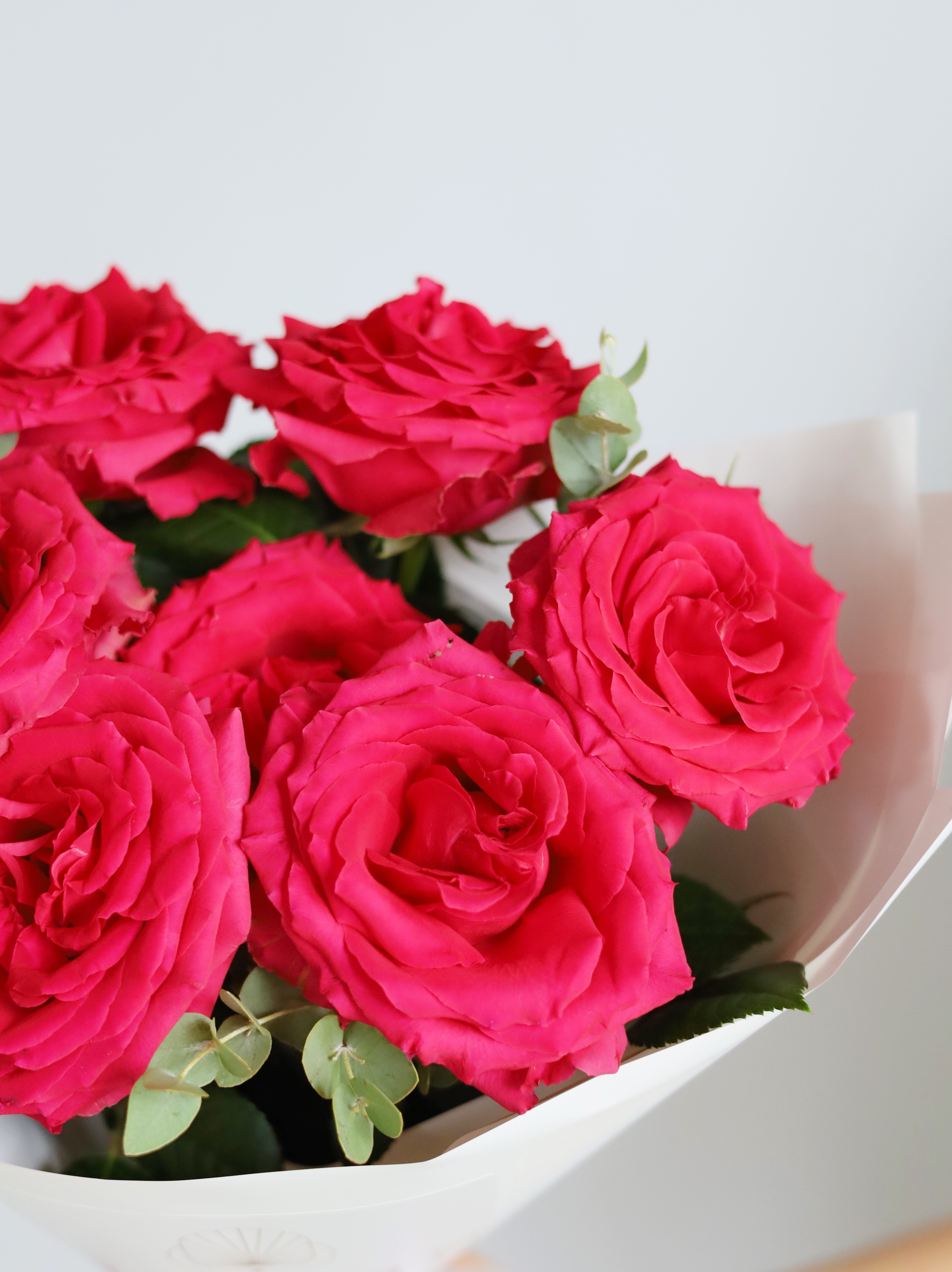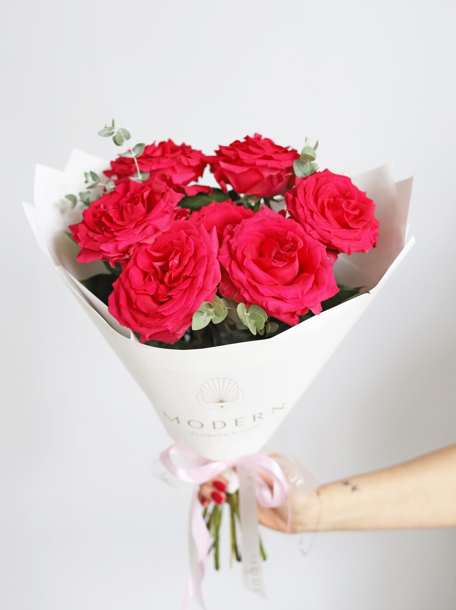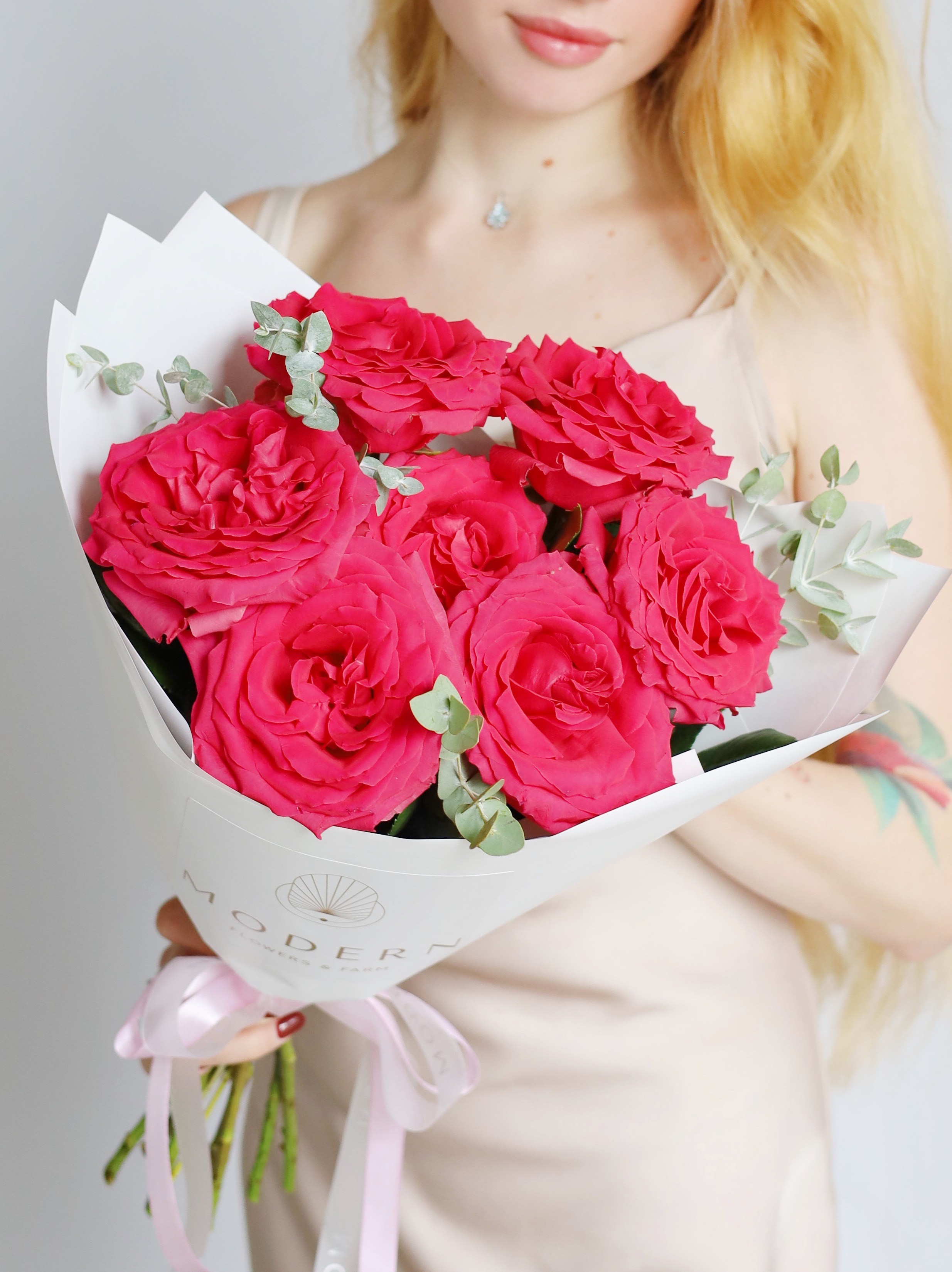 —БУКЕТ С ЯРКОЙ ПИОНОВИДНОЙ РОЗОЙ И ЭВКАЛИПТОМ