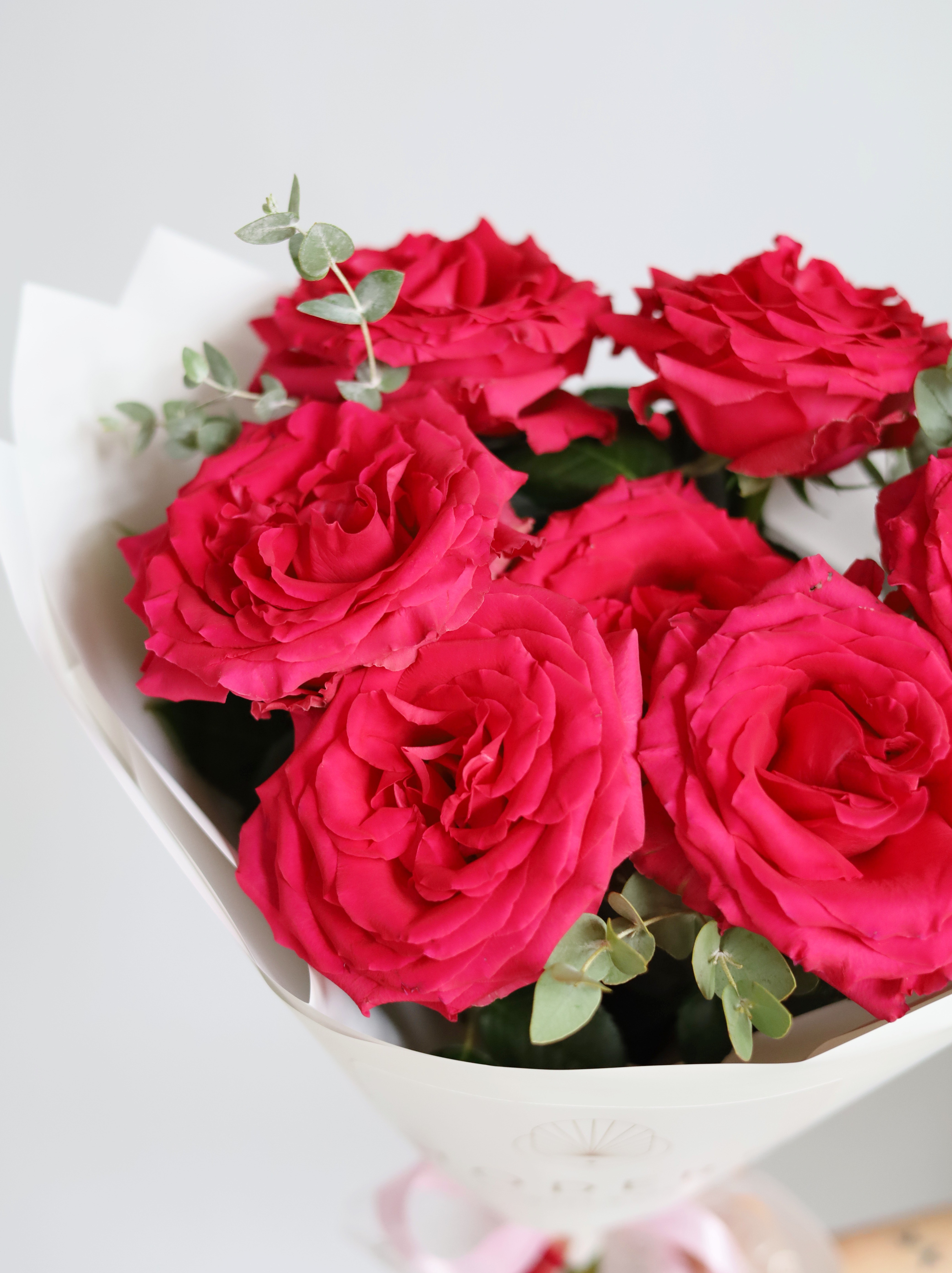 БУКЕТ С ЯРКОЙ ПИОНОВИДНОЙ РОЗОЙ И ЭВКАЛИПТОМ