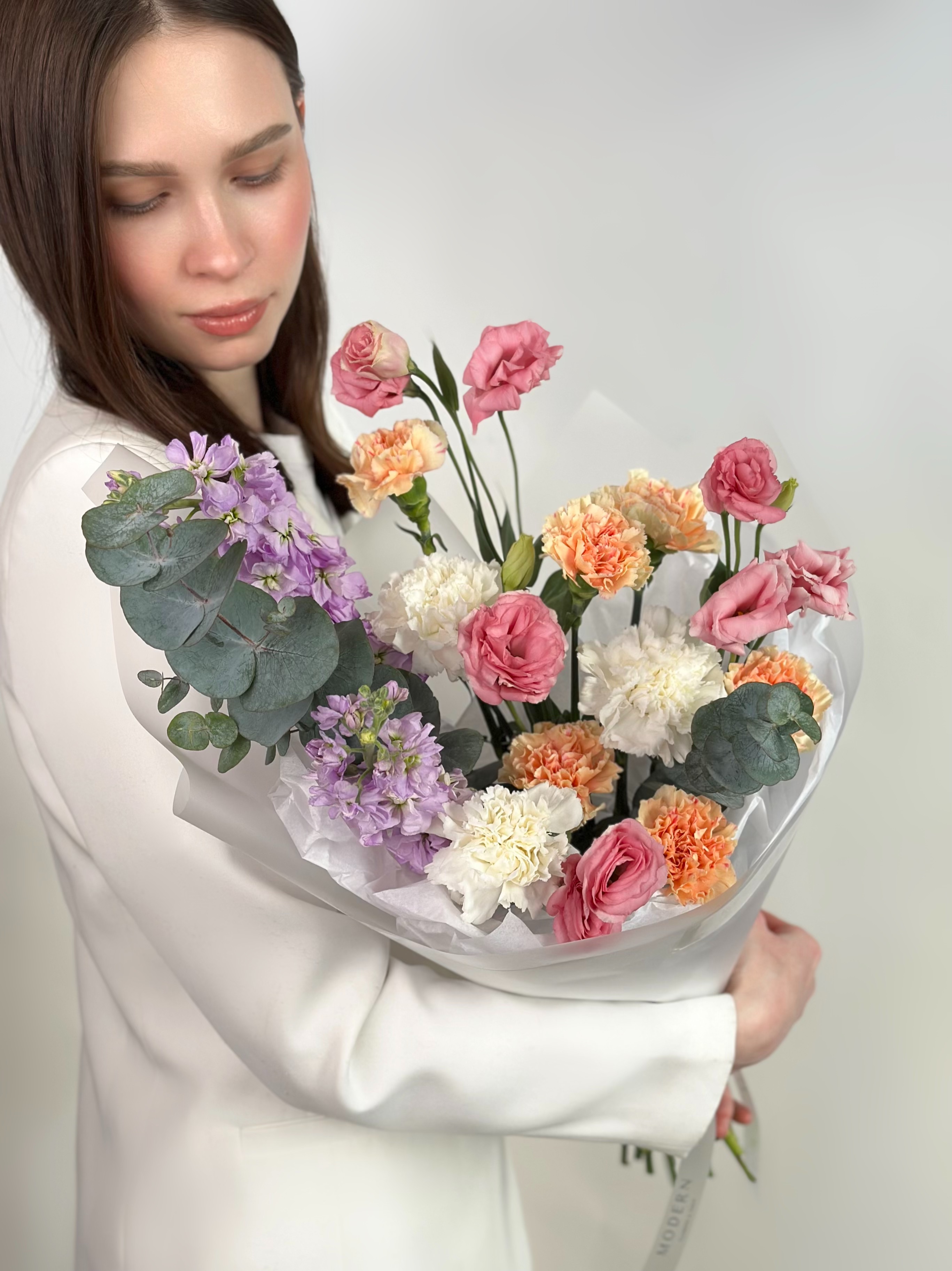 БУКЕТ В ПАСТЕЛЬНЫХ ОТТЕНКАХ С МАТТИОЛОЙ, ЭУСТОМОЙ И ГВОЗДИКОЙ