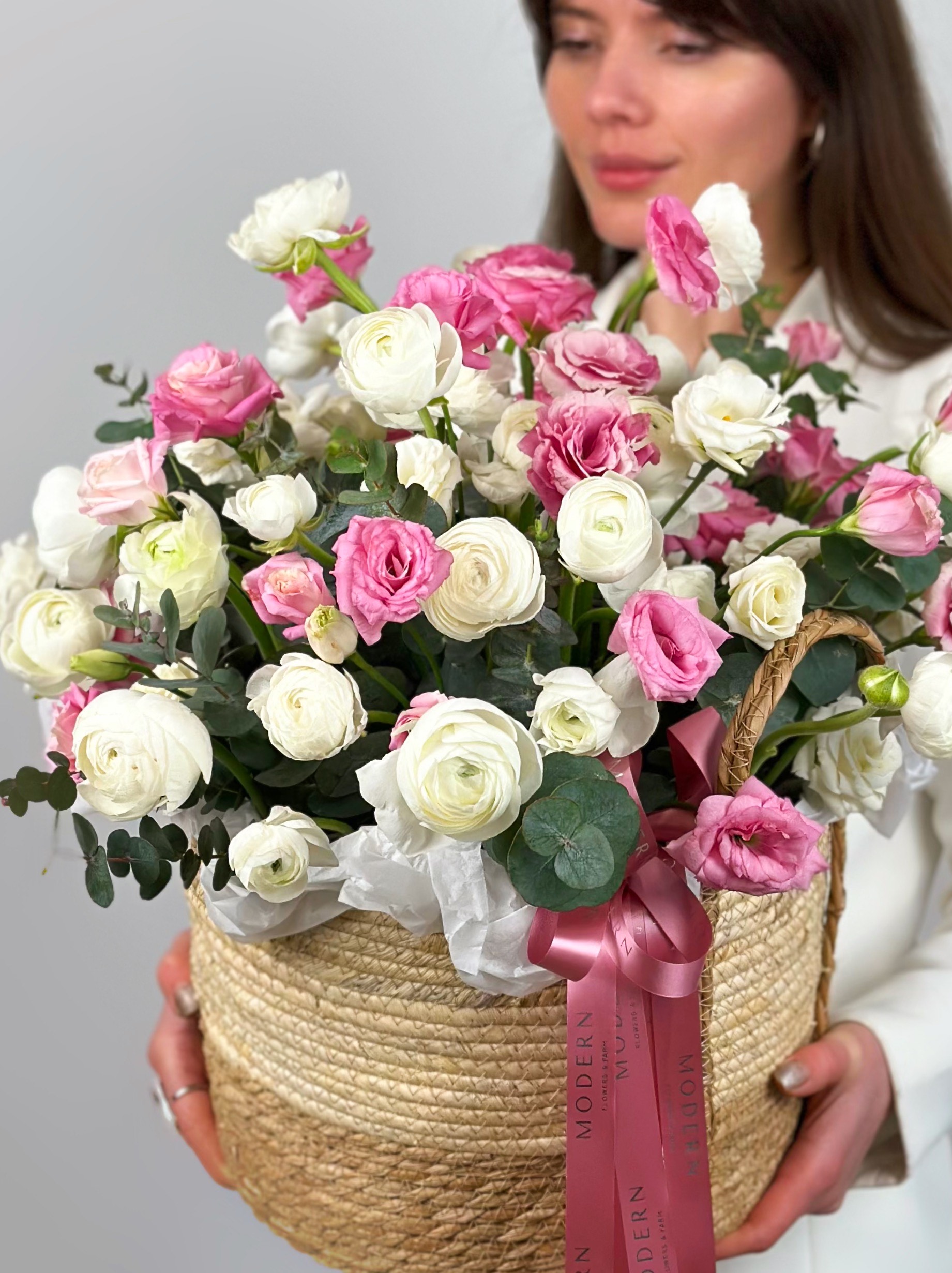 —КОРЗИНА С РАНУНКУЛЮСАМИ, ЭУСТОМОЙ И ЭВКАЛИПТОМ