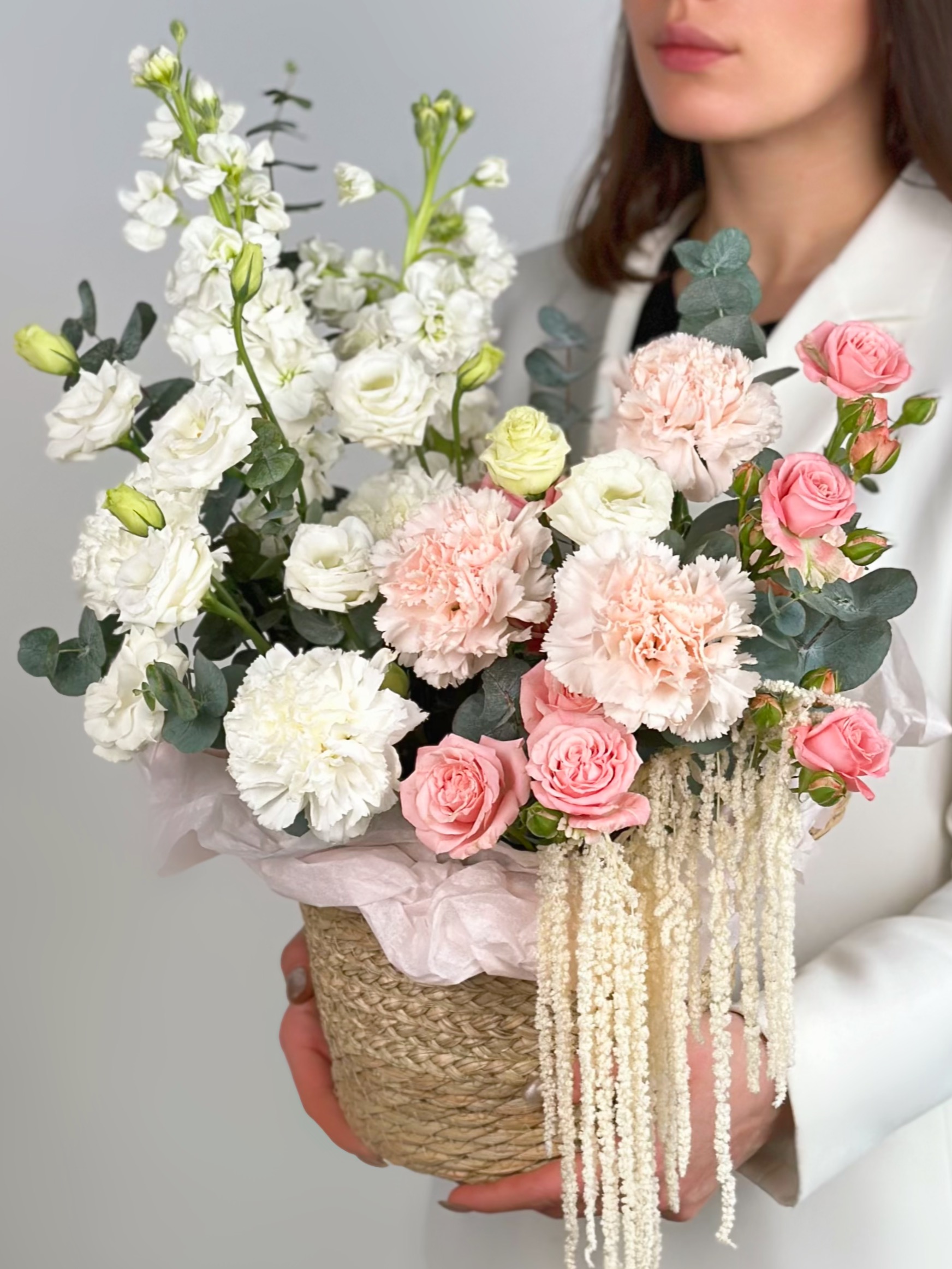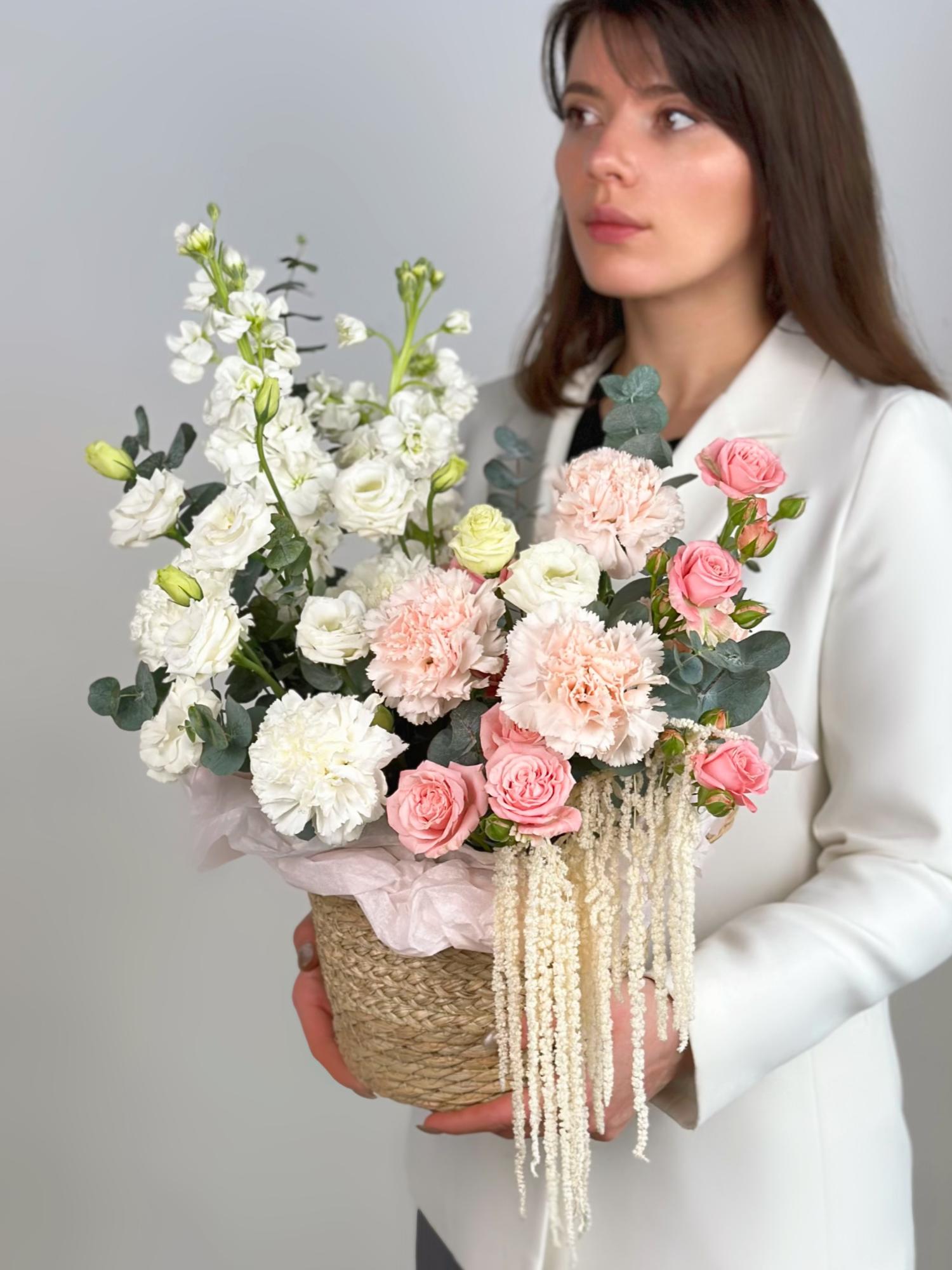 ПИОНОВИДНАЯ КУСТОВАЯ РОЗА, МАТТИОЛА, ЭУСТОМА В ПЛЕТЕНОЙ КОРЗИНЕ