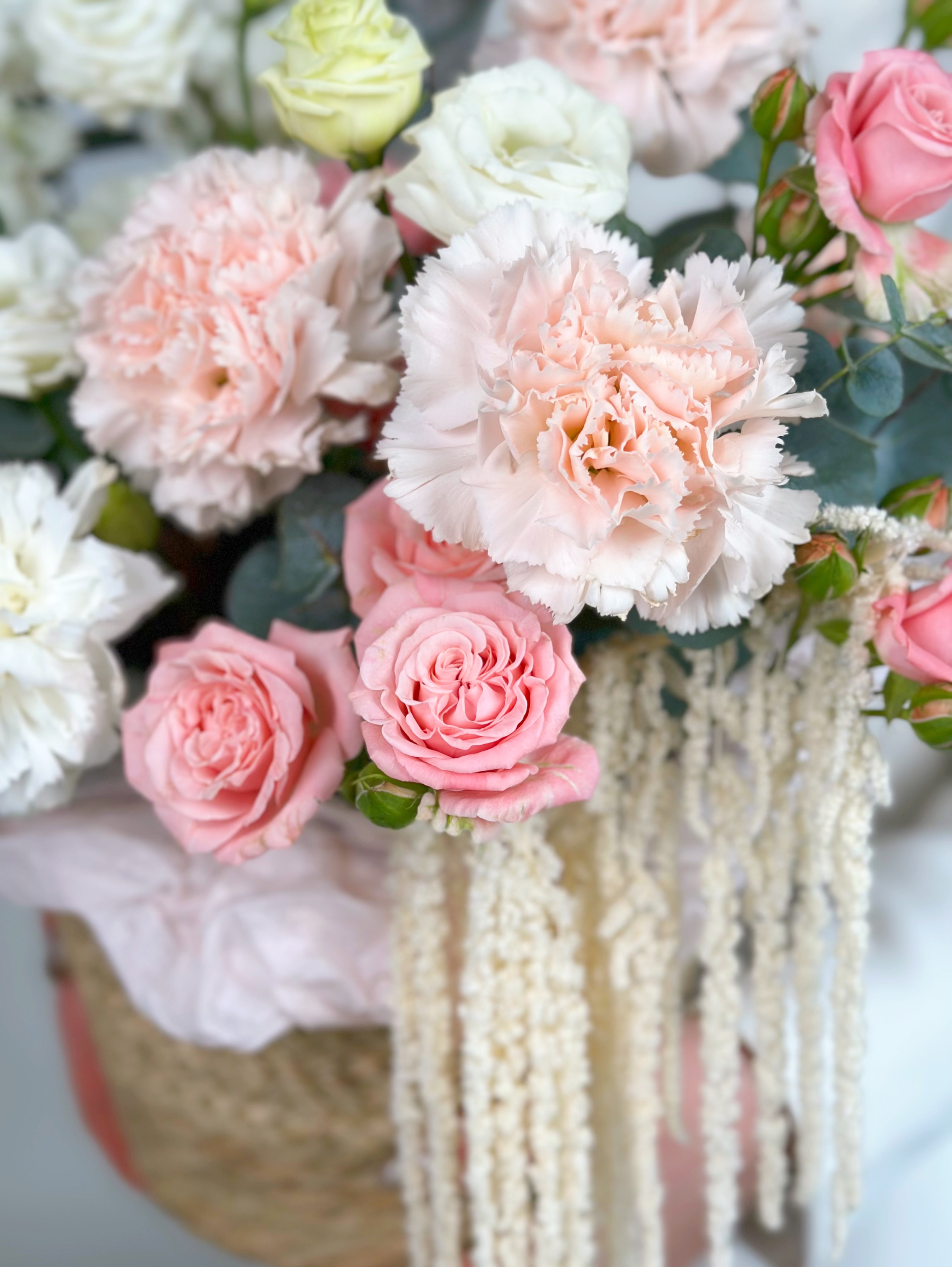 —ПИОНОВИДНАЯ КУСТОВАЯ РОЗА, МАТТИОЛА, ЭУСТОМА В ПЛЕТЕНОЙ КОРЗИНЕ
